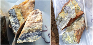 Hurley East Project: (Left) Quartz vein float with banded stibnite mineralization (Right) Quartz vein hosting banded arsenopyrite-pyrite mineralization